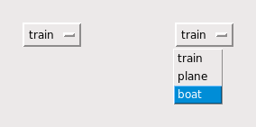 На иллюстрациях выше показано OptionMenu в двух состояниях. Левый пример показывает виджет в его начальной форме. В правом примере показано, как он выглядит, когда мышь кликнула на нем и провела вниз до пункта меню 'boat'.