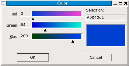 Если пользователь нажмет кнопку "OK" во всплывающем окне, то возвращаемым значением будет кортеж (triple, color), где triple - кортеж (R, G, B), содержащий значения красного, зеленого и синего в диапазоне [0,255] соответственно, а color - выбранный цвет в формате '#RRGGBB'.